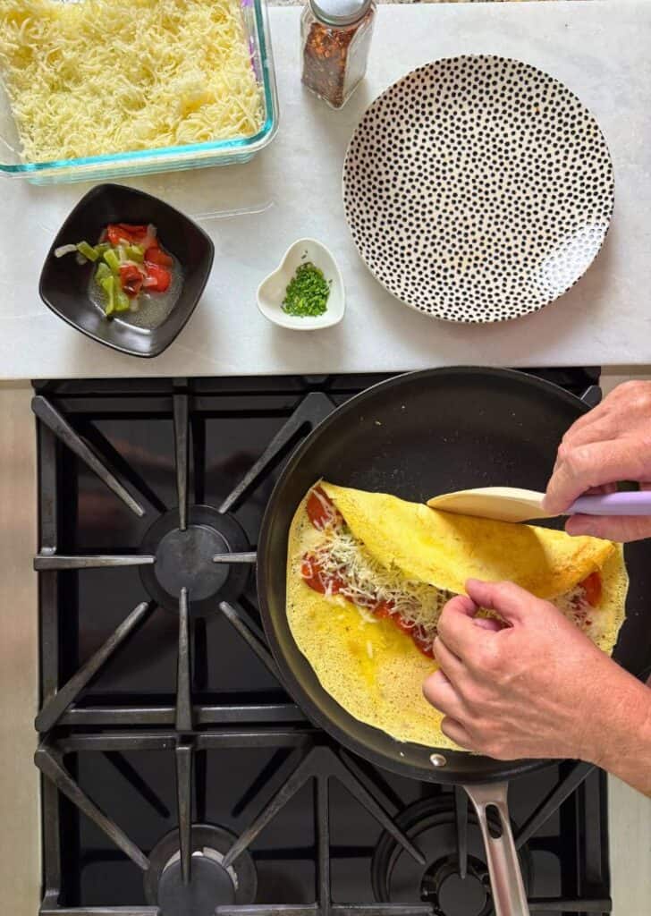- Let cook another 1–2 minutes until cheese melts. Fold each side toward the center (like a burrito).